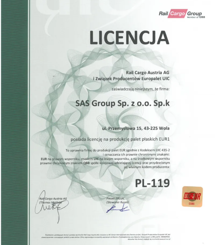 - Licencja EPAL - umożliwia zastosowanie palet w największym systemie pooling w Europie i gwarantuje jakość nośników towarów. Nasze klocki paletowe uzyskały licencję EPAL i są stosowane w licznych wielkich systemach wynajmu palet oraz przez dużych odbiorców końcowych.